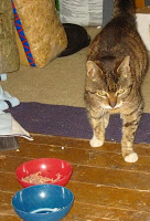 Hij was dus de struiken aan het uitkammen toen er iemand voorbij liep. "Heb je laatst misschien een poesje hier gezien?" vroeg hij. Ja hoor, dat had hij. Zo heeft Wisky dus het hele weekeinde bij mensen thuis gezeten. Ze hadden Wisky zien zitten, gewoon achter onze eigen achtertuin nota bene! En als je een poesje ziet zitten die het fijn vindt om aangehaald te worden, dan neem je die mee naar huis. Want dan zal ze wel verdwaald zijn. Heel gewoon allemaal. Ik klink misschien een beetje cynisch, maar dat ben ik ook. Sterker nog, ik ben bloedlink op het moment!! Geloof me, ik ga er van uit dat de mensen (die hier gewoon achter ons wonen) alleen maar goede bedoelingen hebben gehad hoor. Kijk maar eens naar foto 2, wat een 'lekker' rond buikje ze daar heeft. Wisky is erg mager. Ze is oud en oude katjes zijn vaak erg mager. Ze krijgt gewoon haar voer en ze is kerngezond. Nu staat haar buikje strak gespannen en puilt aan alle kanten uit. Een kat zal van nature eten 'tot hij er bij neer valt' want je weet maar nooit wanneer je weer een prooi te pakken krijgt. De mensen hebben zaterdag de dierenambulance gebeld met de melding dat ze een jong katje hadden gevonden. Dat had de mevrouw van de ambulance ook wel gezegd tegen mij, maar ja, Wisky is niet jong. Als kenmerken had ik doorgegeven dat Wisky een erg klein katje is en dat ze mager is. De mensen hebben hun kinderen beloofd dat als 'Taksi' na 2 weken niet opgehaald zou zijn, dat ze haar dan in huis zouden nemen. "Nou, dat was dan ook niet voor lang geweest" zei mijn lief ze nog. Toen de dierenambulance maandag het katje op kwam halen, zeiden ze ook dat Wisky hóóguit 1 jaar moest zijn. Nou ja zeg!!!!! Stelletje vrijwilligers!!!! Ik heb ooit zelf bij de dierenambulance stage gelopen en over het algemeen neem ik mijn petje voor ze af. Maar nu?? Sorry hoor, maar dit is toch van de zotte?! Als ambulancepersoneel zou je toch iets verder moeten kijken dan je neus lang is! Ze is traag en lang niet zo kwiek als een jong katje. Haar gebit ziet er echt niet meer zo mooi uit als 19 jaar geleden. Als ze een beetje opgelet zouden hebben, dan had het een hoop trammelant gescheeld. Om over de kosten nog maar niet te spreken!! Als die lui van hier achter gewoon hun handen thuis gehouden hadden, met al hun goede bedoelingen, dan hadden wij al die tranen niet gehad. Maar goed, vanmorgen heb ik meteen met het asiel gebeld. "Oh, u belt voor dat oude katje?" Kijk, zo kan het dus ook. Ik kon haar meteen ophalen. Samen met ons jongste dochtertje ben ik naar het asiel gegaan. Ze hoorden mijn verhaal met open mond aan. Ongelooflijk vonden ze het. Eenmaal thuis sprong Wisky meteen in de vensterbank en ze wilde graag naar buiten. Brrr... eng. Maar ja, dat is ze zo gewend. Ik deed haar naar buiten en ik bleef er even bij. Ik was bang dat ze meteen naar dat andere huis zou lopen want daar kreeg ze lekkere sardientjes enzo. Maar ze bleef in de tuin. Ik had haar geen bandje omgedaan omdat ze daar altijd zo'n ruzie mee had. Dan stak haar voorpootje er weer doorheen en het was altijd een hele toer om haar daar weer van te verlossen. Maar nu heb ik toch maar het bandje gepakt, dan zien mensen in ieder geval dat het een huiskat is. Ik ben meteen naar de dierenwinkel gefietst om een adres kokertje te halen. Wisky bleef buiten, haar buik was nog zo vol, ze kon nog geen honger hebben. De meneer van de dierenwinkel kende het verhaal. De mensen zijn namelijk zaterdag bij hem in de winkel geweest omdat ze een katje van een jaar hadden gevonden. Dus ze hebben echt wel hun best gedaan, zelfs foto's gemaakt, alleen ze hebben het verkeerd ingeschat.